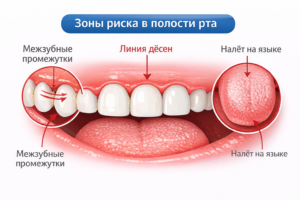 Зубная щётка очищает только видимую поверхность зубов. Однако бактерии активно накапливаются в так называемых «зонах риска»: